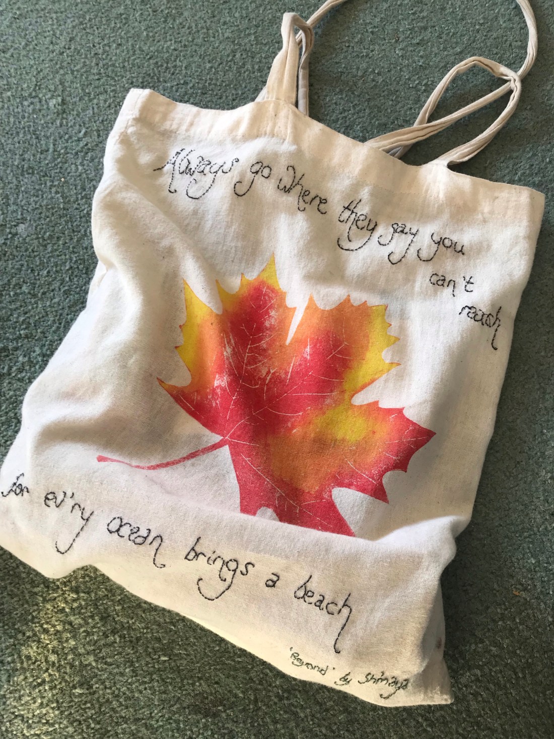 My friend Laura taught me how to make the print on this bag, and gave me the materials, space and time to make it. Then, inspired by the poem Beyond by Sh’maya, and by the book The Thread by Victoria Hislop, leant to me by my friend Katharine, I sewed the words onto it probably a couple of years ago, long before I had any plans to travel around the world. What a gift it turned out to be.