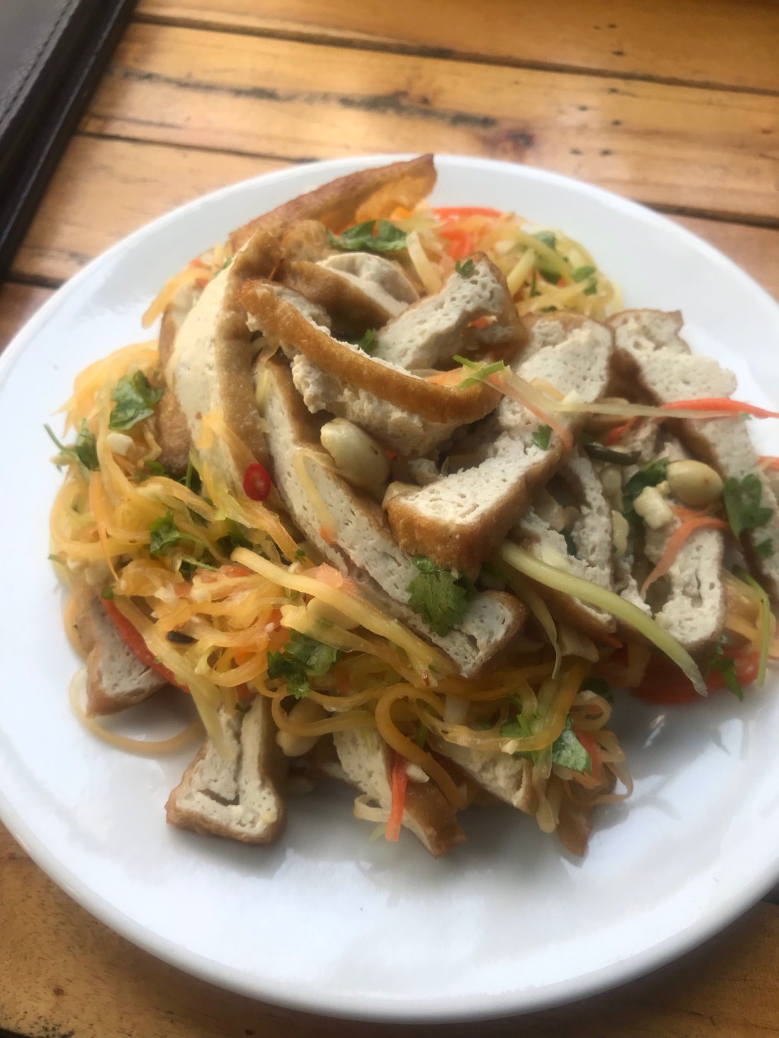 Delicious tofu and papaya salad dish, with a characteristic sweet chilli type sauce. Really really tasty!:
