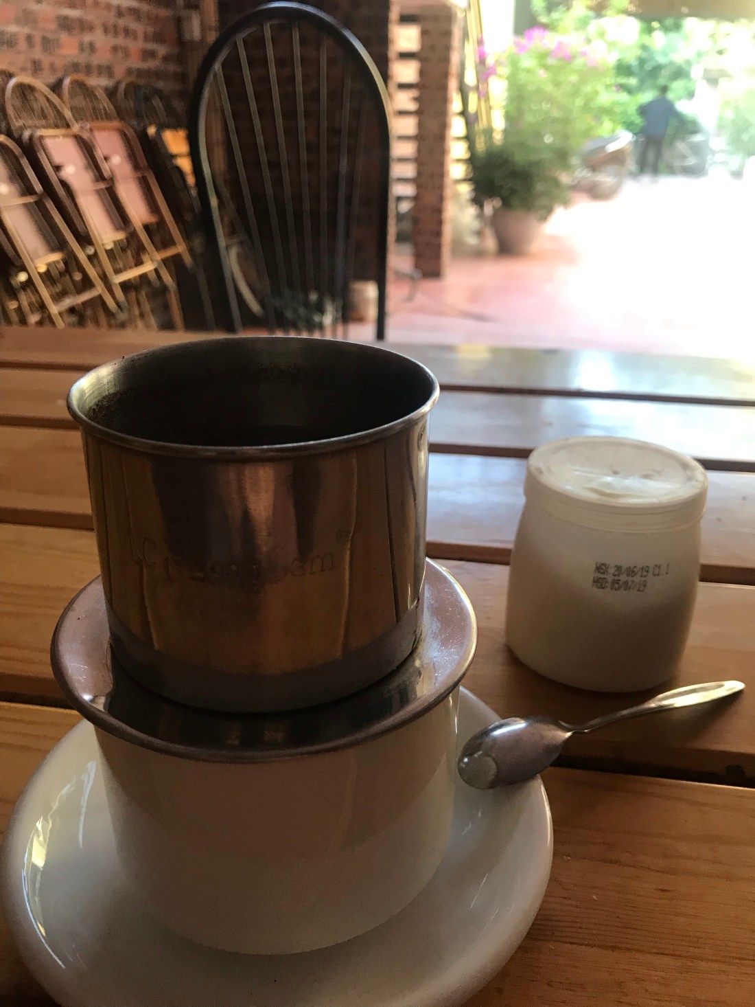 Having walked for an hour and a half with a big backpack from the Homestay towards the station in the centre of Ninh Binh, I found a place to stop for a cold coffee, and a custard apple smoothie and the obligatory warm green tea: