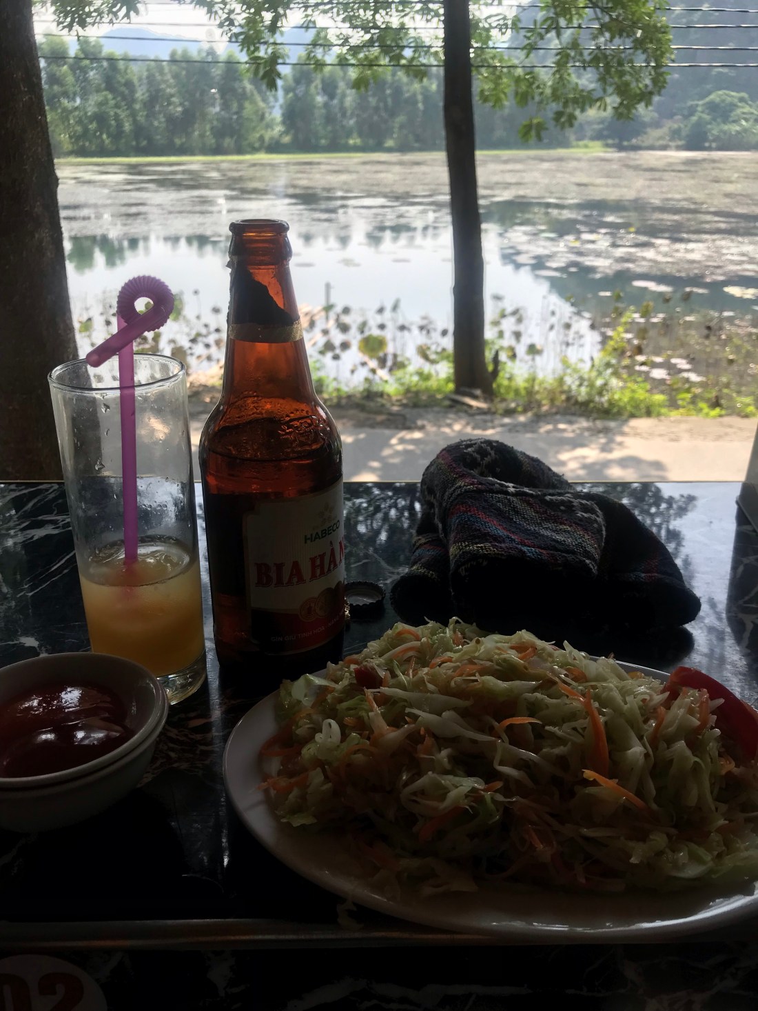 An enormous plate of shredded cabbage and carrot, with noodles and soy sauce and some other kind of flavours made a great lunch one day in a backpackers pub place opposite a beautiful lake: