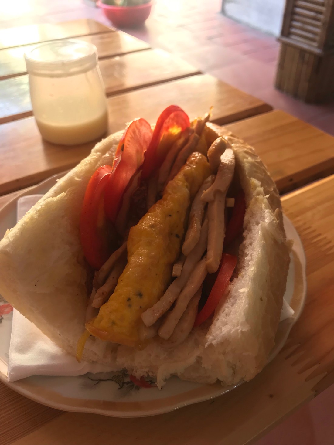Breakfast at Mai Spa Homestay – the best banh my Vietnamese sandwich I had. With pork here and omelette. Nice coffee too: