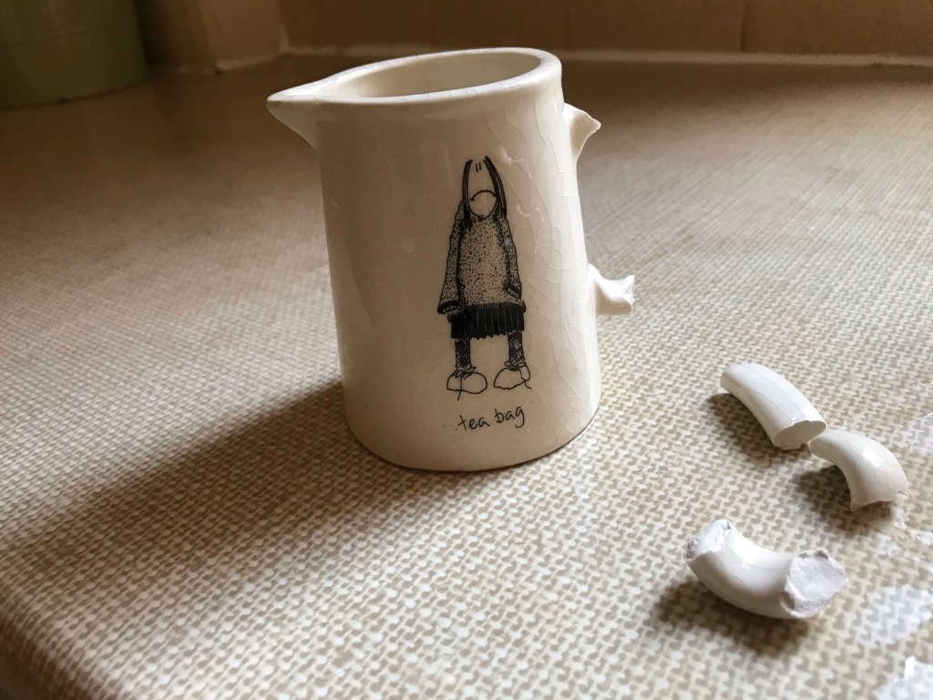 A day or two after my friend had shared the poem, I accidentally knocked my favourite little milk jug on the floor, and the handle shattered. I bought this funny little jug on holiday, and although it has always annoyed me that it won’t go in the dishwasher, it holds sentimental value for me. It reminds me of the friends I was with when I bought it. And it has made a lot of people smile since.