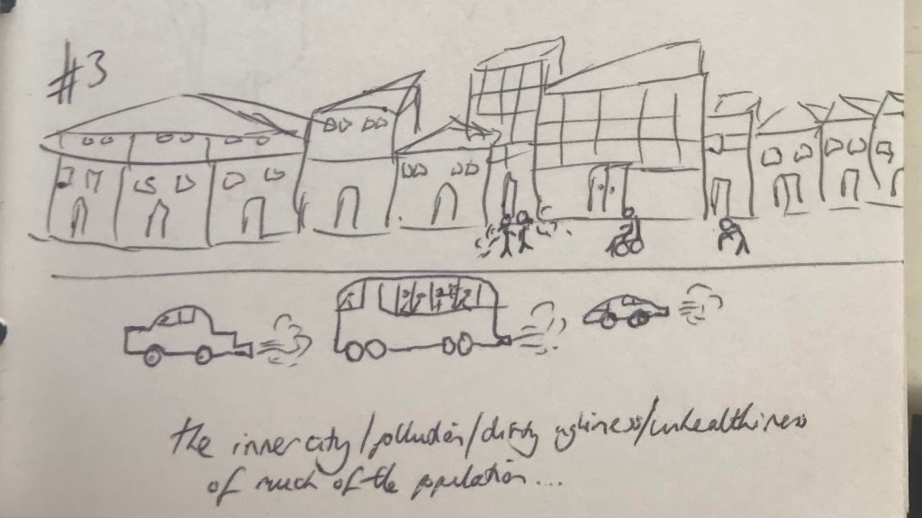 When I was seriously ill 5 years ago, I was mainly reduced to walking everywhere, as I didn’t want to get the bus (having low immunity), and, being unwell, I didn’t always feel safe driving. Because I wasn’t contained in a box on wheels, I became much more aware of the pollution, vehicle noise and litter in the city. I drew this cartoon, and resolved to drive less going forward, and give the earth and all of us a rest from it all: