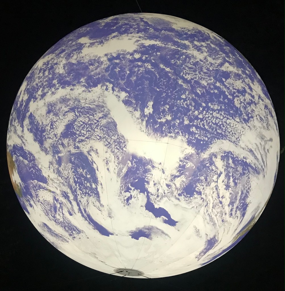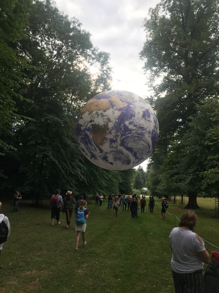 I had the extraordinary experience of encountering Gaia, by Luke Jerram, hanging in mid air outside at Greenbelt Festival recently. It’s an inflated globe, with NASA images of the earth from space somehow projected on it. It glows at night. During the day, you could hear recordings of the astronauts’ astonished conversation as these images first came into view for them as you walked under the globe.