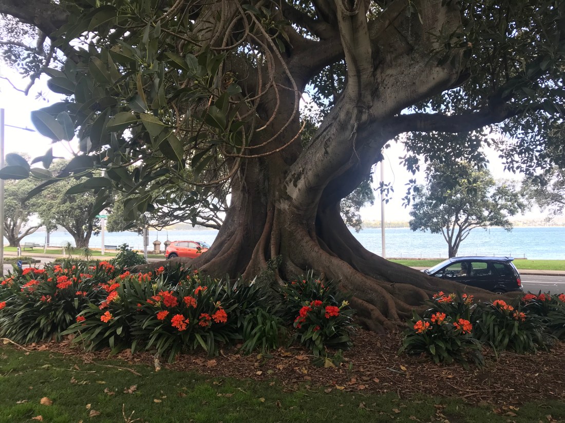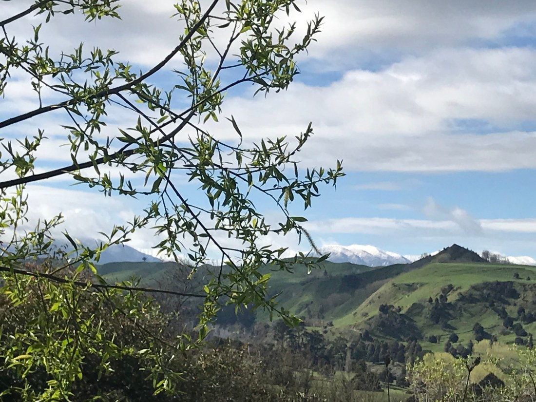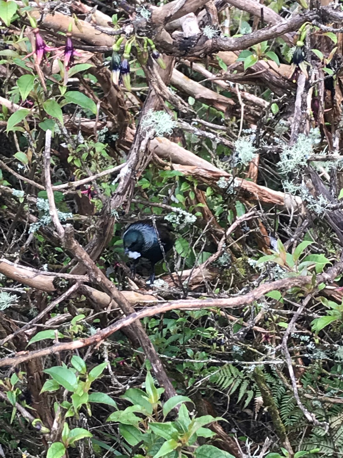 I finally managed to get a photo and a video of a tui. It’s not very good, but it’s something! (These beautiful birds are sometimes known as the “parson bird” apparently, because the little white pom pom flourish at their throats looks a bit like a dog collar!) Their song is magical.