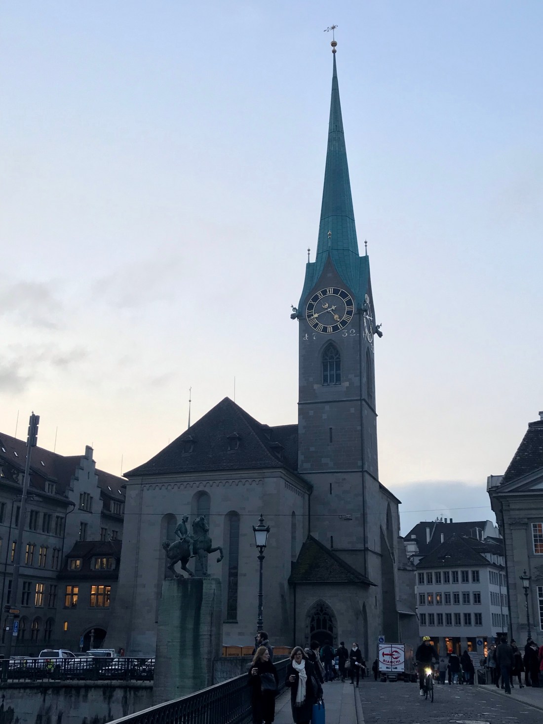 On my way back to the station, I managed to have a quick look around the Grossmünster and the Fraumünster (two of the biggest churches in the middle of Zürich) just before they closed. I was particularly interested in the latter, which began life as a Benedictine convent, founded in 853 by Louis the German for his daughter Hildegard. He gave the convent the land of Zürich, Uri and the Albis Forest. In 1045, King Henry III gave the convent the right to hold markets, collect tolls and mint coins, which apparently effectively made the Abbess the ruler of the city. But in 1336 the city’s first independent mayor was appointed (ie not the Abbess’ appointment), and the convent’s political power waned.