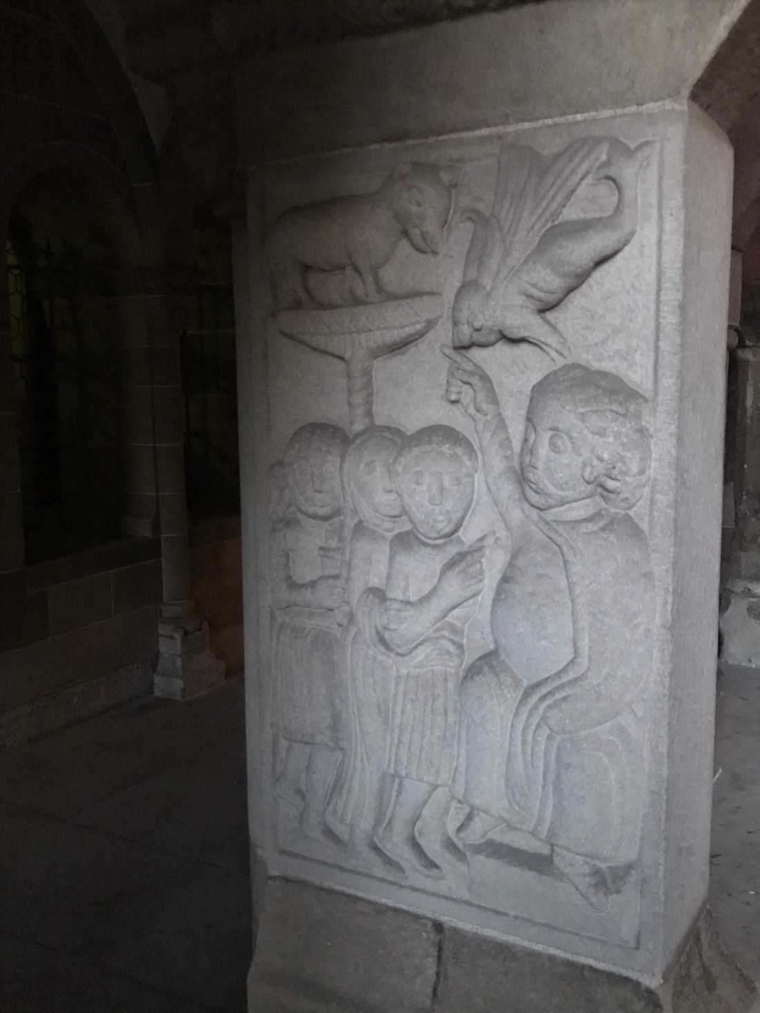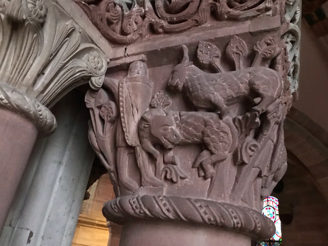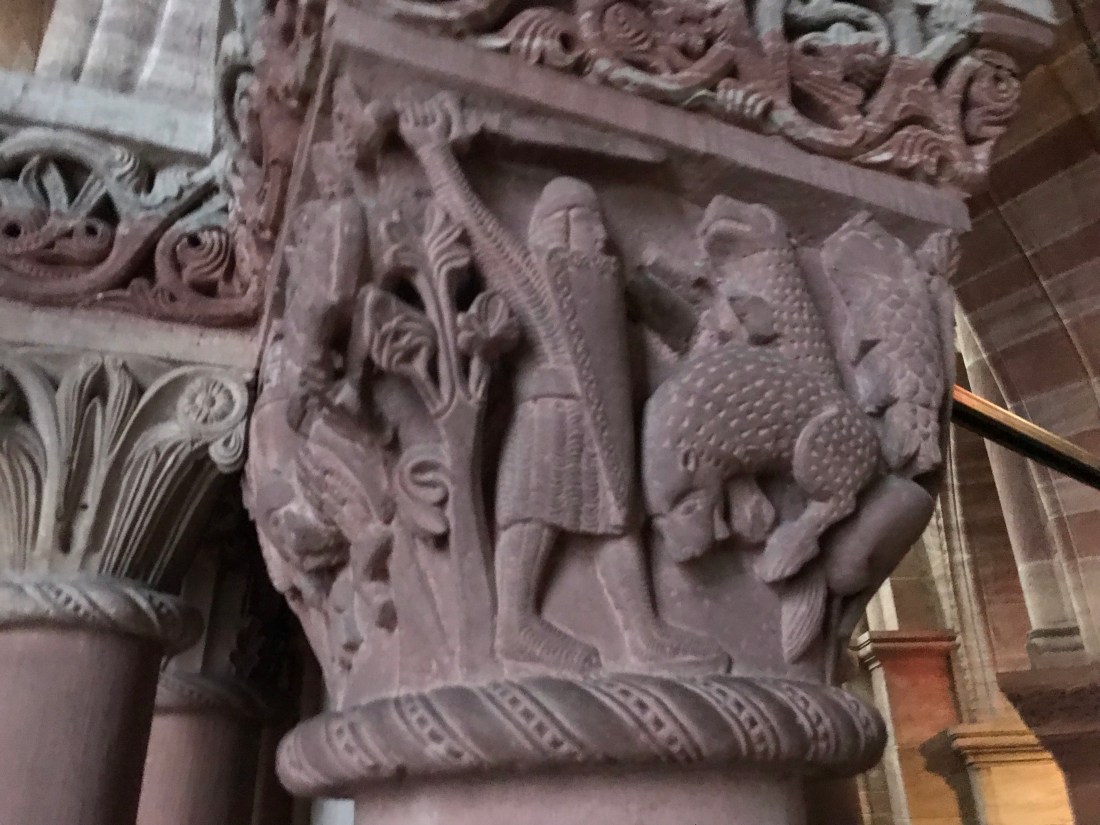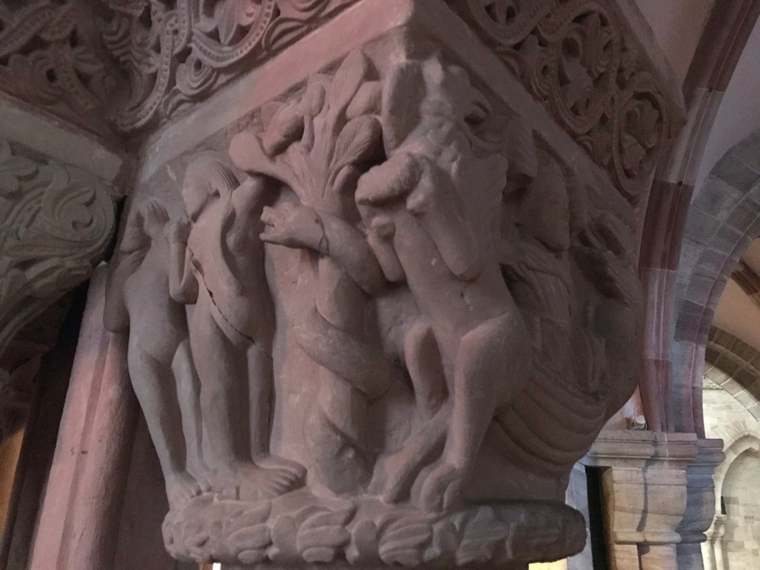 We admired some of the older stonework inside the minster. Some of it depicts Bible stories like this piece showing Adam and Eve and the serpent: