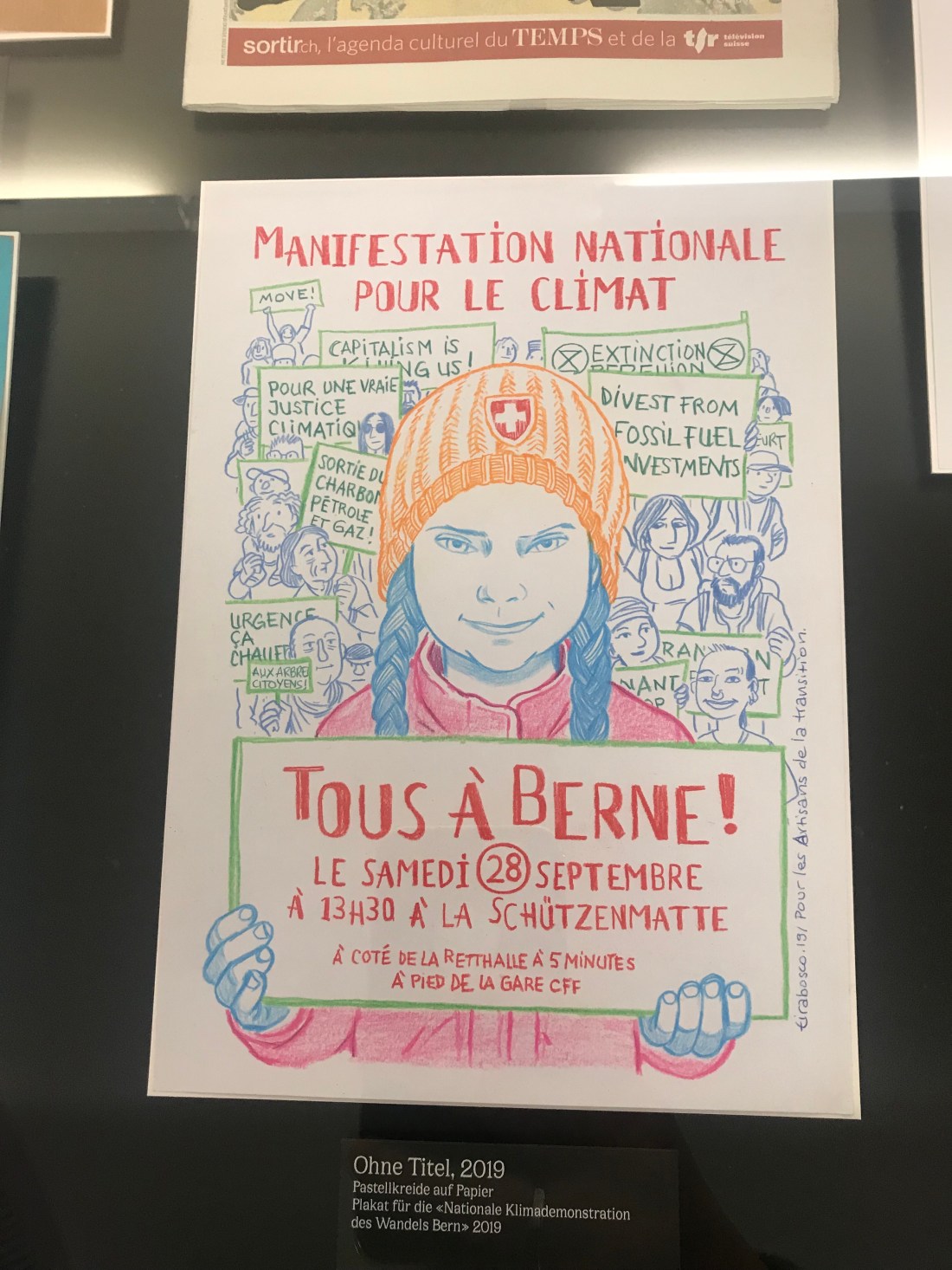 In the Cartoon museum (there seems to be a tendency to call art galleries museums here for some reason – maybe in the hope that the art will taken seriously? – aha! I have been corrected, this is because in Germany (and perhaps therefore also in German speaking Switzerland) a gallery is a place where the art is for sale, whereas a museum is where you just go to look at it. Come to think of it, maybe it’s like that in England too?), I saw an extraordinary collection by Tom Tirabosco who creates a lot of art relating to our relationship with the environment and climate change, often depicting businessmen in sharp suits with their heads obliterated by burning fossil fuels, interspersed with disturbingly accurate depictions of dead birds. Not what I was expecting from a cartoon museum, but well worth engaging with, anyway.