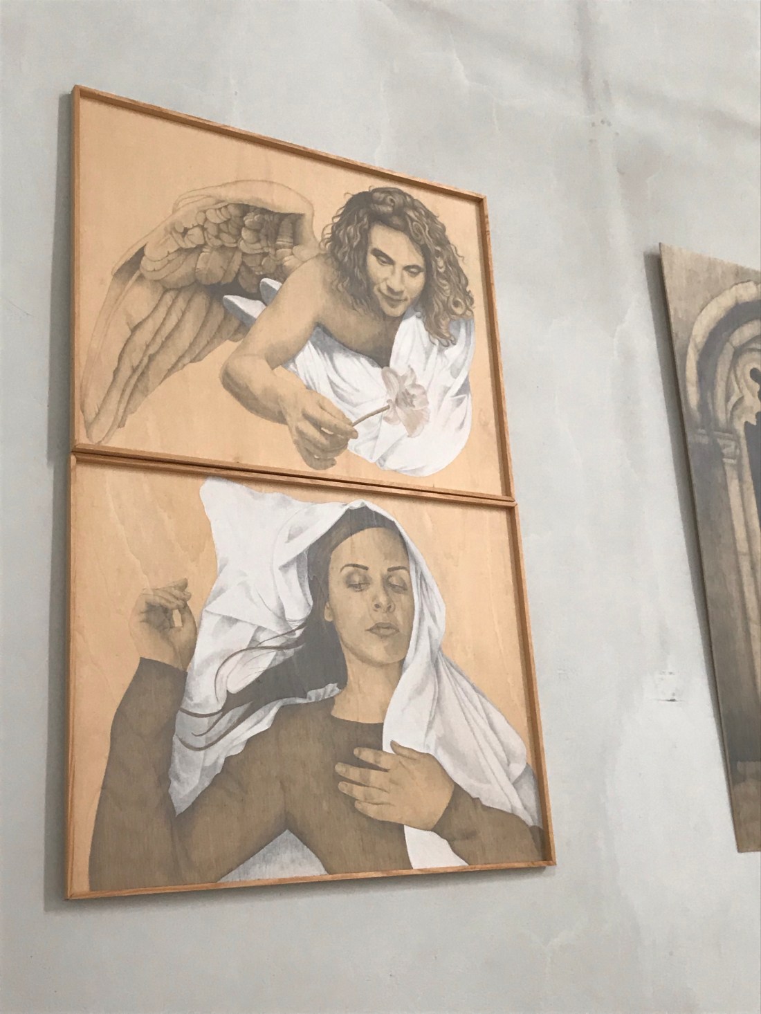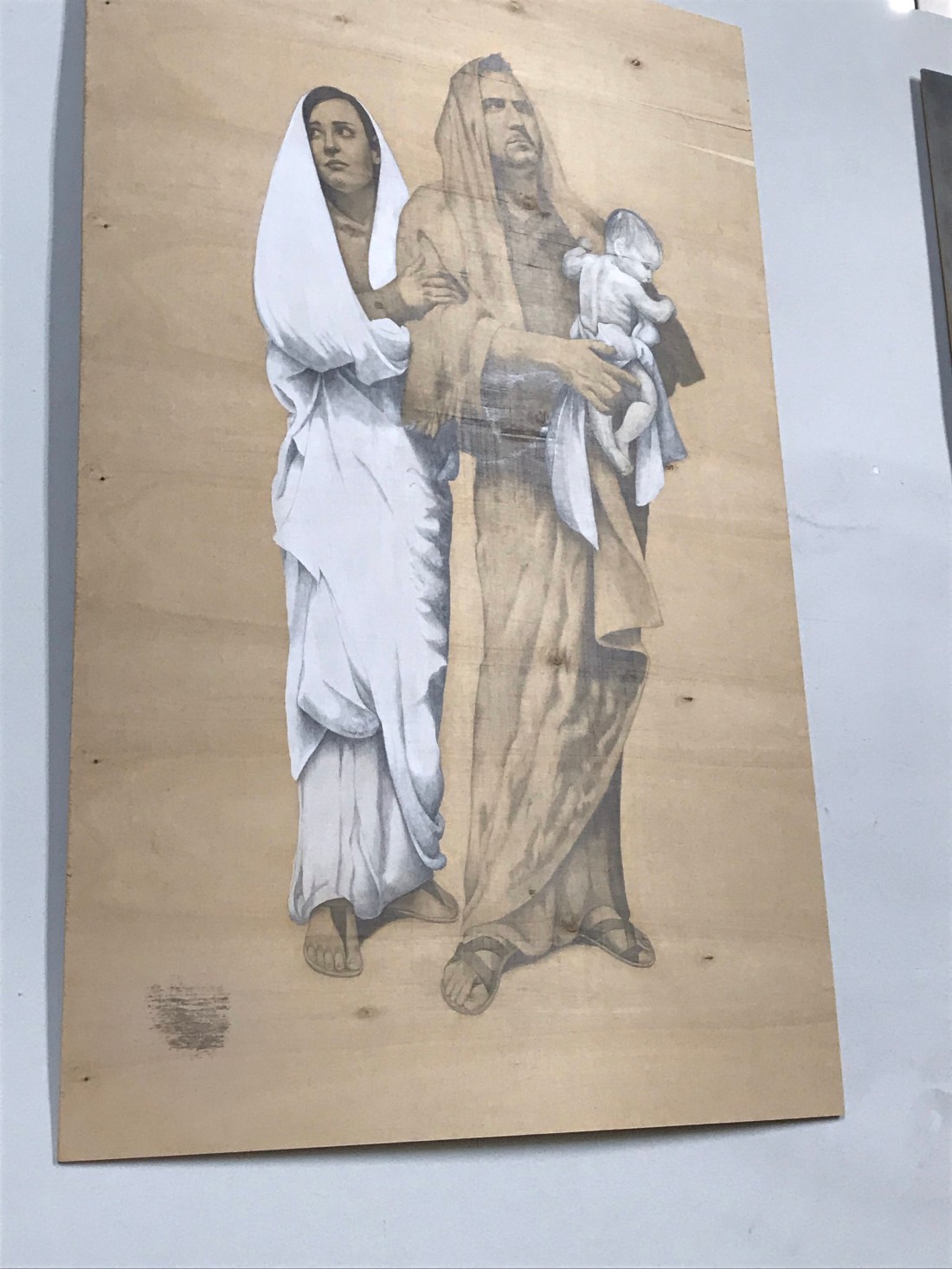 In the church there was an exhibition depicting the life of Mary by the Italian artist Stella Radicati. She made the angel Gabriel look pretty fit, I thought! And I liked that Joseph was taking responsibility for carrying the baby while the couple fled to Egypt, looking suitably worried: