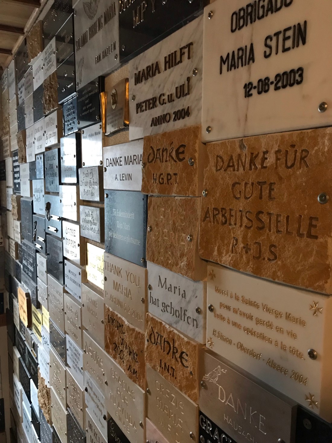 Hundreds of plaques line the walls of the tunnel that leads to the grotto under the church containing a famous statue of Mary. People have sent the plaques to record their thanks for answered prayers.