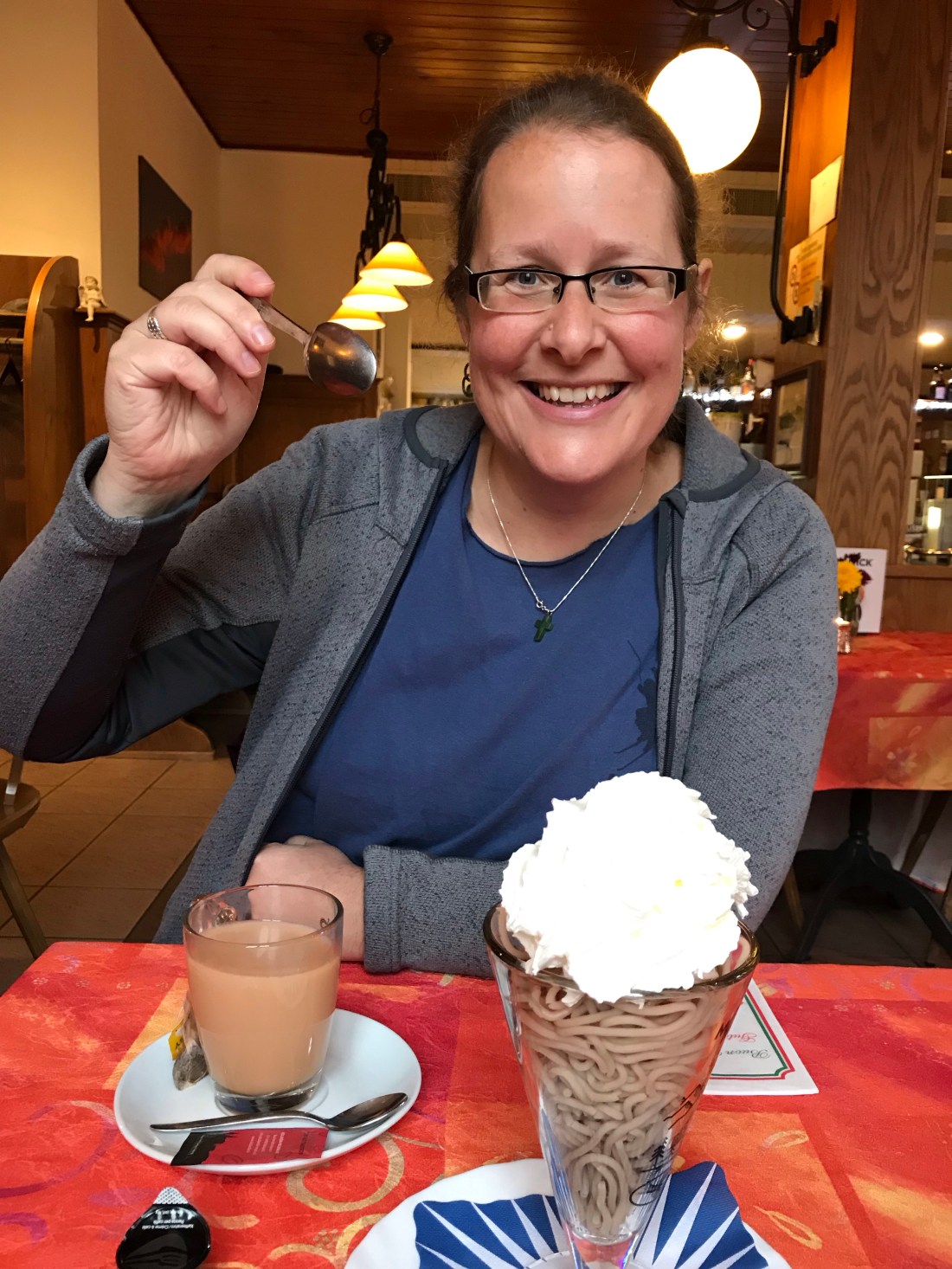 We repaired to a local café where Delia persuaded me to try Vermicell. A slightly sweet dessert made with cooked chestnuts mushed up and then squeezed through something like an icing bag to make the worm like shape.