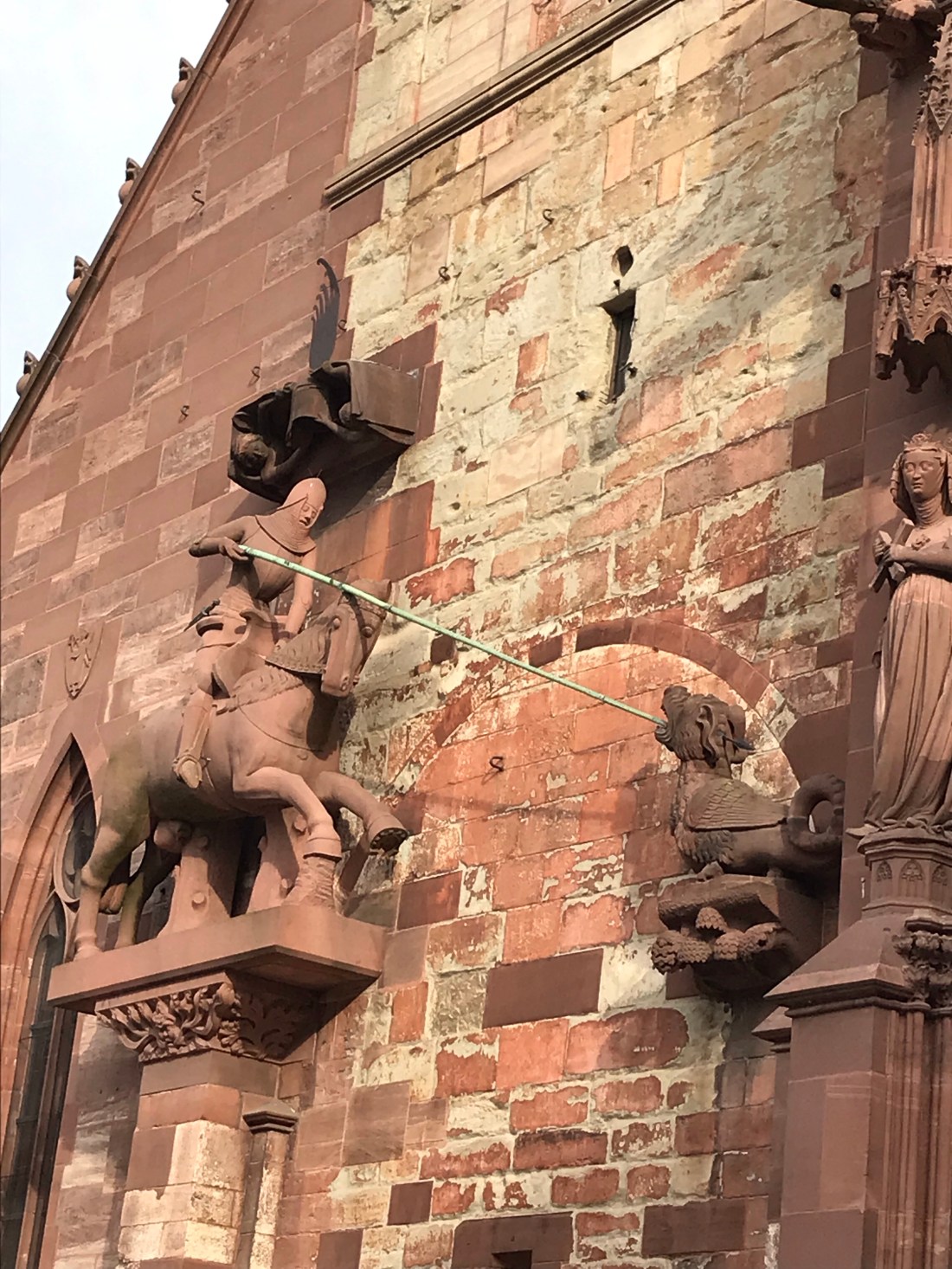 If I remember correctly, below is the figure of St Martin (you’ve a Saint who shares your name, brother!), who in the story cut off his cloak to give it to a beggar. But apparently at some point historically, the people didn’t want an unsightly beggar depicted on the front of their minster, so they changed the beggar into a tree stump. So now St Martin is apparently cutting off his cloak… for no good reason!!