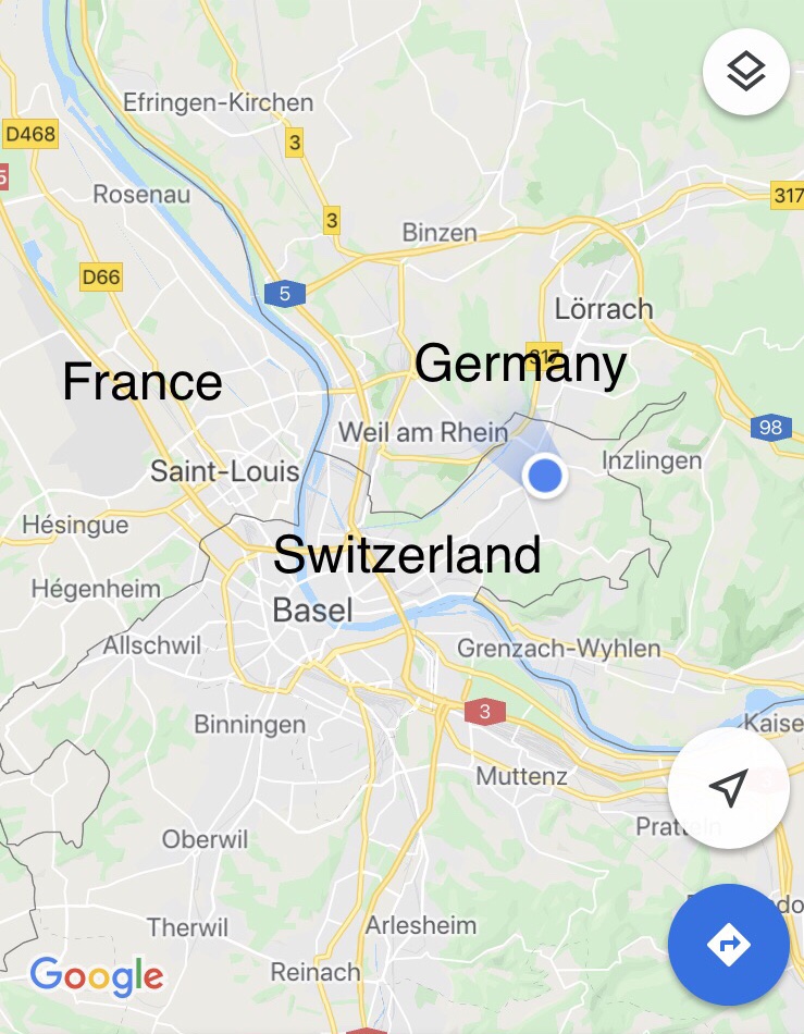One of the extraordinary things about Basel is its proximity to France and Germany. There are places where you can be standing in one country and you can see the other two. Or where you are effectively walking along the border between two of the countries, though there may be very little evidence of it.